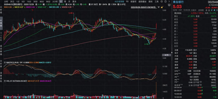 1月29日早盘,青岛银行(002948.SZ)股价高开高走,涨幅冲到8%以上,PB为0.68倍,市值达到293亿元。